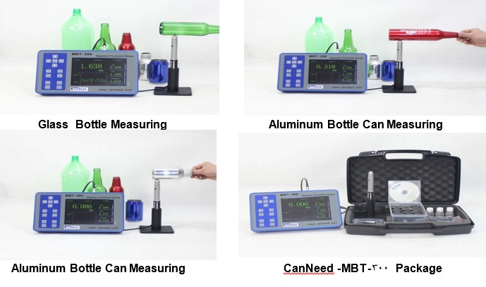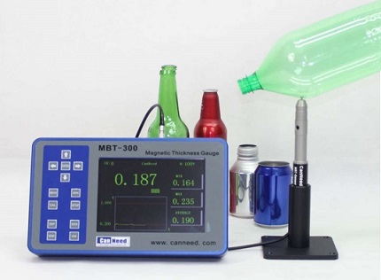 (Magnetic Bottle Thickness Gauge)” is a refined portable thickness gauge. It is used to measure the thickness of nonmagnetic material, such as plastic, glass, synthetics, aluminum and titanium, etc. The measurement accuracy is undistorted by the samples shapes. CanNeed-MBT-300 is based on the theory of Hall Effect. For test, place the steel ball on one side of the sample and the probe on the other side. The Hall Effect sensor on the probe measures the distance from the probe tip to the steel ball. The calculator will display the real thickness readin.